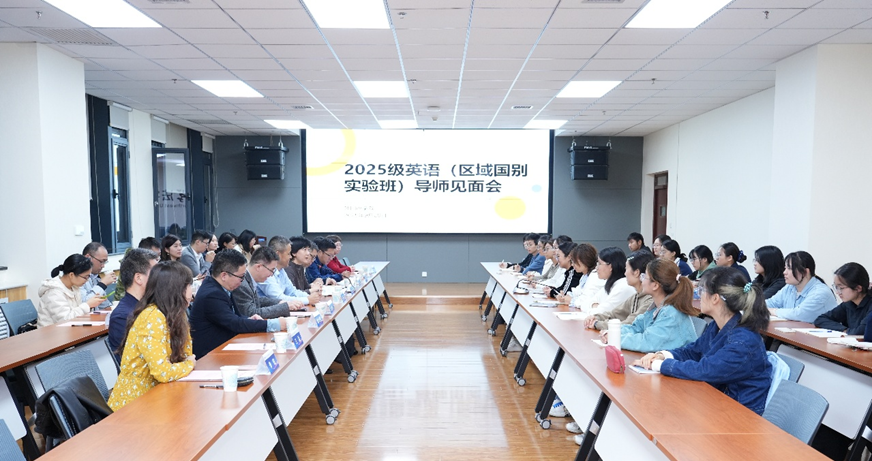 2025年9月28日晚7时,万象城awcsport官网2025级英语(区域国别实验班)学业导师见面会在我校长安校区西学楼北0904报告厅顺利举行。会议由万象城awcsport官网院长曹若男主持,区域国别学院副院长李福泉、全体学业导师、万象城awcsport官网英语系主任李铁、班级教务、辅导员、相关负责人及实验班 20名同学共同参会。