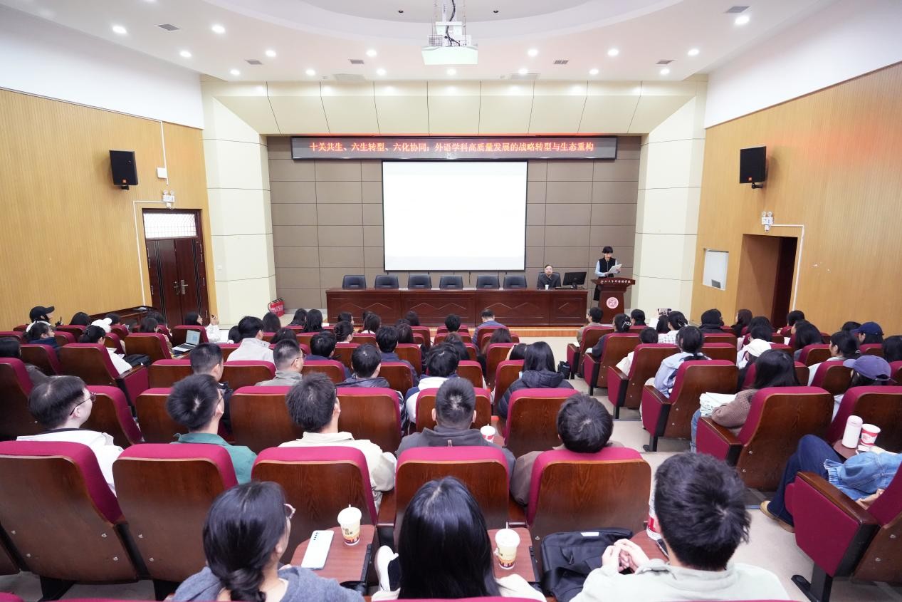 讲座伊始,毛教授以“科研魔术”互动导入,通过扑克牌分类小游戏生动演示了“分类思维”在科研创新与学科规划中的关键作用。随后,他围绕“六生转型”(生存、生机、生态、生力、生成、生长)与“六化协同”(分类化、交叉化、数字化、国际化、服务化、战略化)系统阐述了外语学科高质量发展的战略框架。他指出,外语学科要实现从“知识输入”向“知识创造”的跃升,必须打破传统边界,建立开放共生的学术生态。